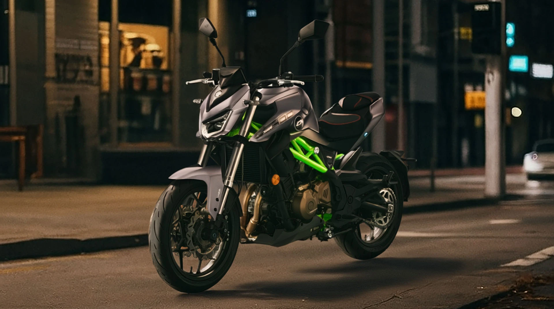 La SRK 400 es una naked deportiva con motor bicilíndrico de 400 cc refrigerado por líquido, ideal para ciudad y carretera. Su chasis ligero, suspensión invertida, amortiguador ajustable y frenos ABS en ambas ruedas garantizan control y seguridad en cada trayecto.