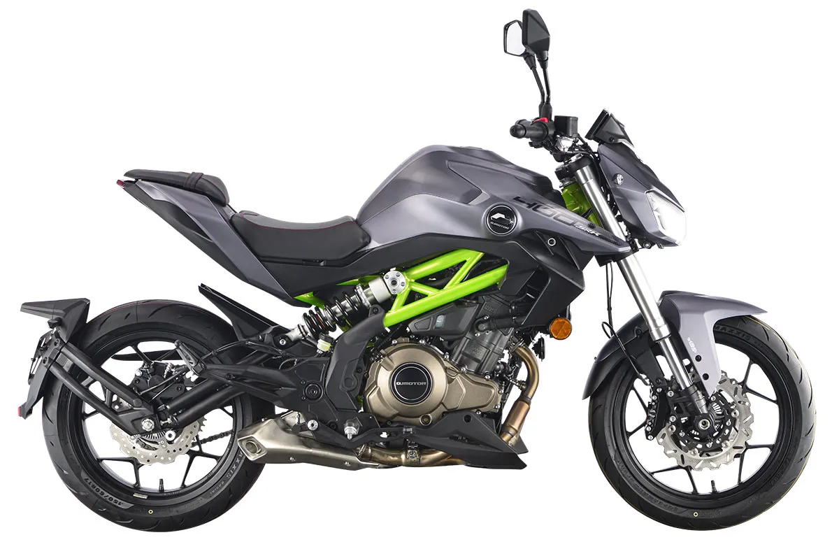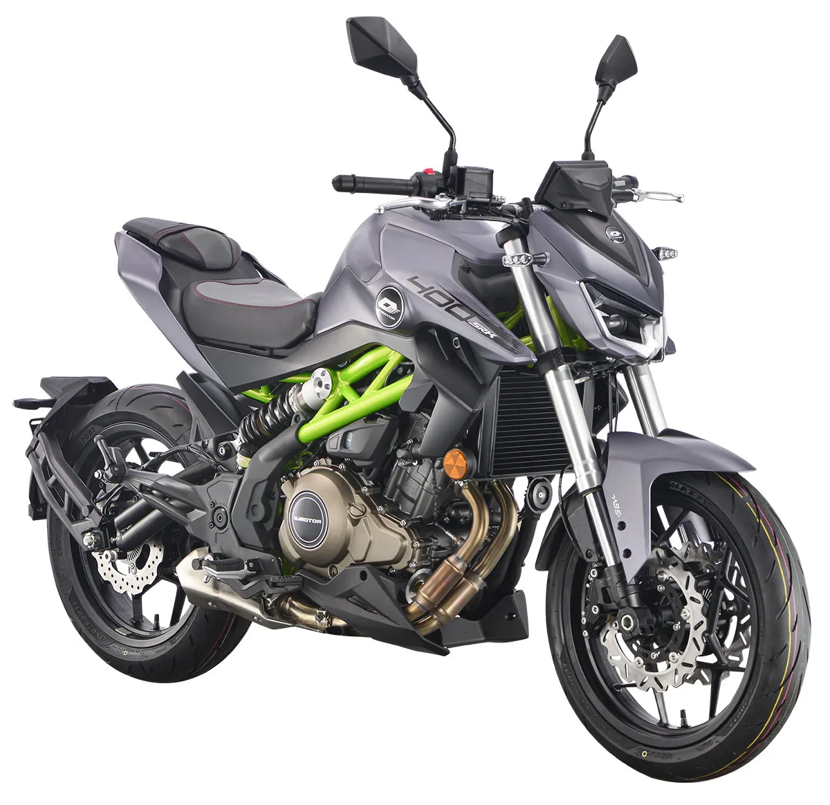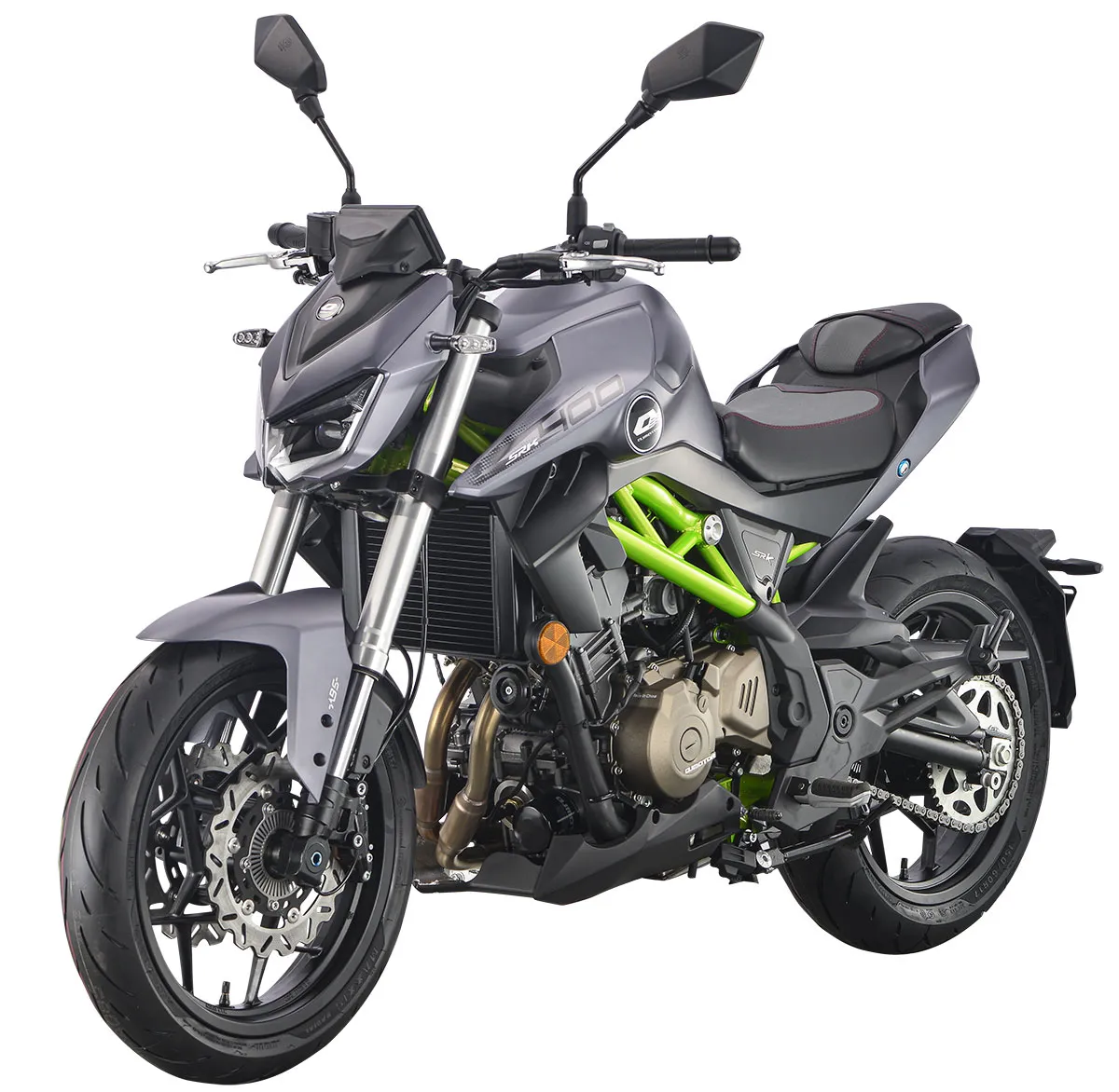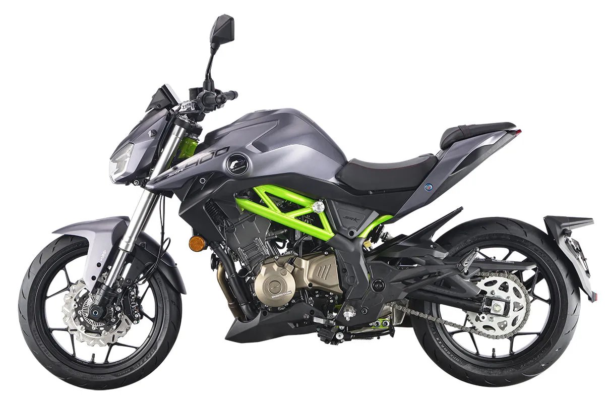 La SRK 400 es una naked deportiva con motor bicilíndrico de 400 cc refrigerado por líquido, ideal para ciudad y carretera. Su chasis ligero, suspensión invertida, amortiguador ajustable y frenos ABS en ambas ruedas garantizan control y seguridad en cada trayecto.
